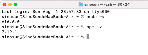 安装包下载并安装后,同样在终端中输入node -v 、 npm -v 验证