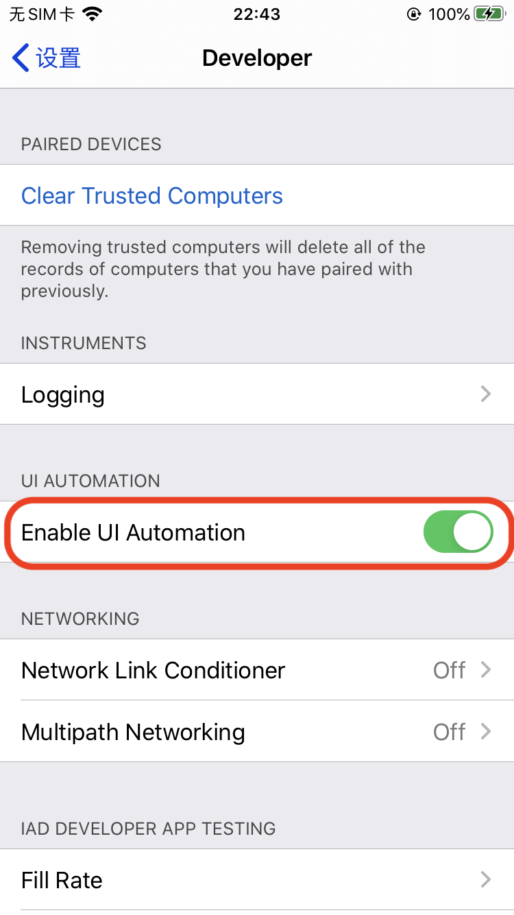 iOS手机端进入设置 --> 开发者 --> 开启“Enable UI Automation”