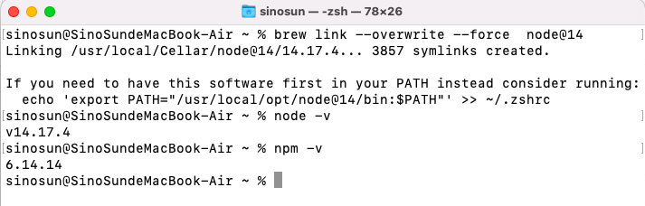 绑定安装的node,命令:brew link --overwrite --force node@版本号