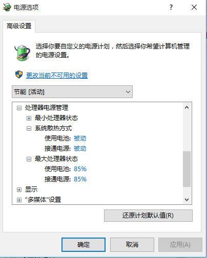 4,修改最大处理器状态为,我设置的是85%(基本不发热,程序相应速度基本不受影响),大家根据自己情况,灵活修改。