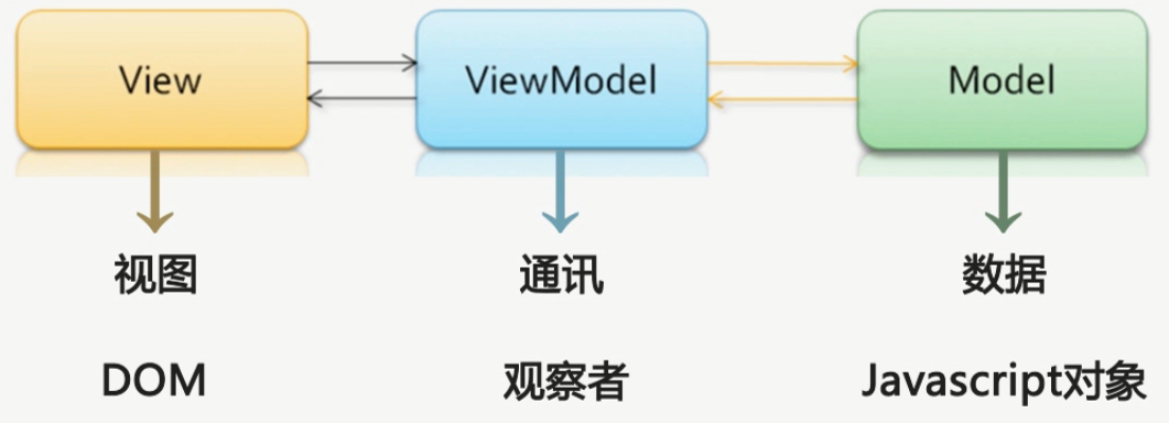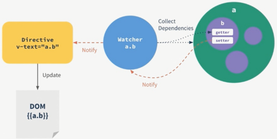 结合上面两张图,再看看下面一张图,进一步理解vue.js实现双向数据绑定的原理(又称为数据响应原理,即数据【model】改变驱动视图【view】自动更新):