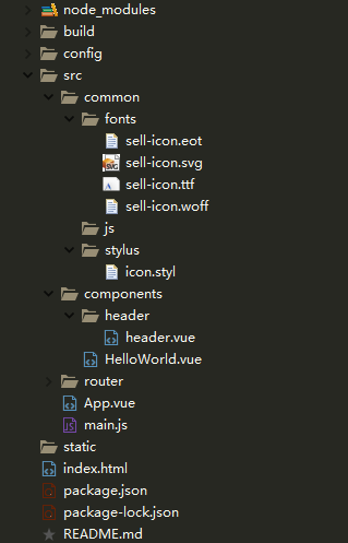 设计好项目目录,将fonts文件夹下的文件复制粘贴进项目中,将style.css复制粘贴进stylus目录中,并改名为icon.styl,同时将里面的内容改为stylus语法