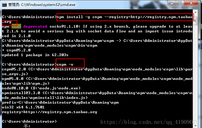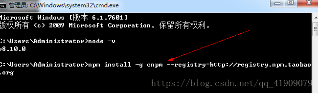 2.1 安装淘宝镜像,输入命令:npm install -g cnpm --registry=http://registry.npm.taobao.org