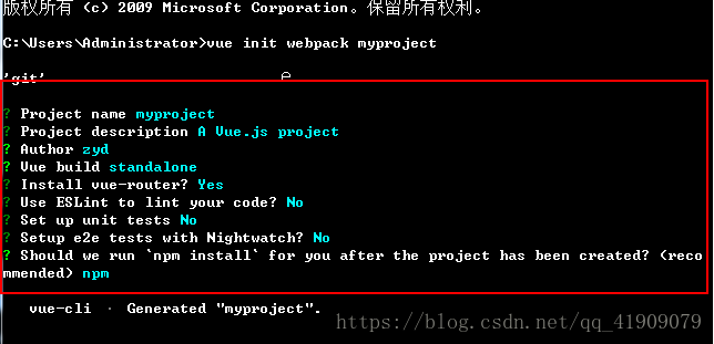 2.5.1 新建项目,输入命令:vue init webpack myproject(myproject为你的项目名称,可自取),这里需要进行一些配置,如图: