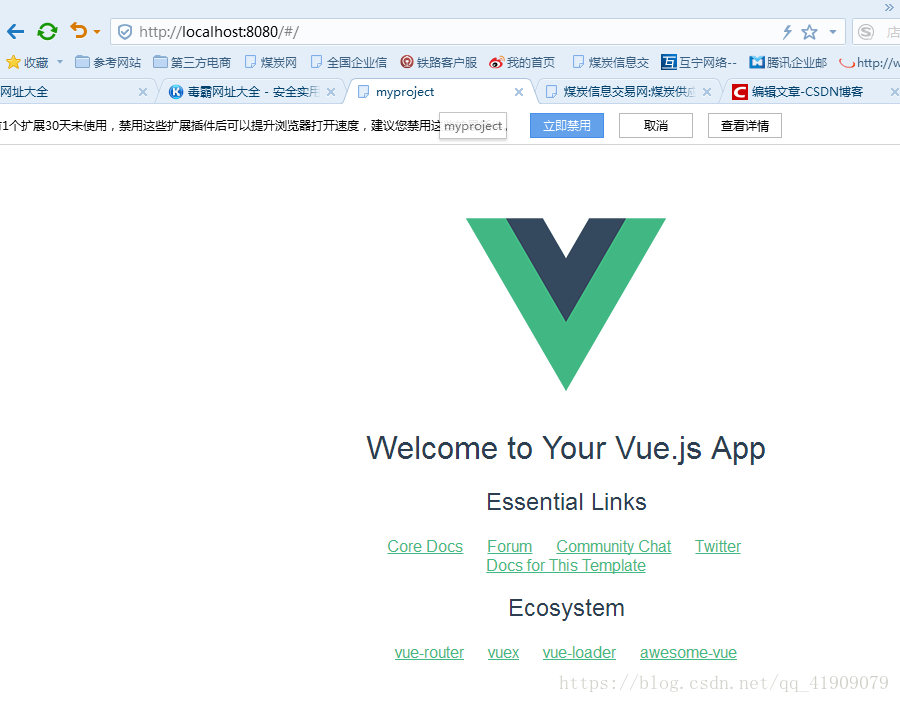 8080就是默认的端口,在浏览器地址栏中输入localhost:8080会发现默认的模块打开了!(注意:Vue.js 不支持 IE8 及其以下 IE 版本。)
