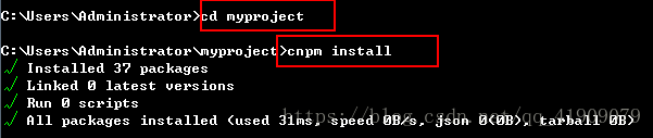 2.5.2打开项目(命令: cd myproject ),安装依赖,输入指令:cnpm install