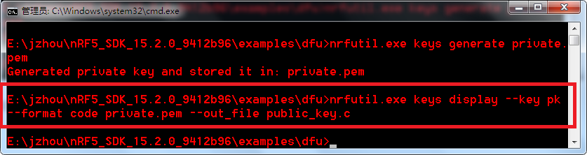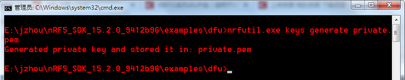 2.在nRF5_SDK_15.2.0_9412b96examplesdfu的目录下打开命令行,输入nrfutil.exe keys generate private.pem回车,