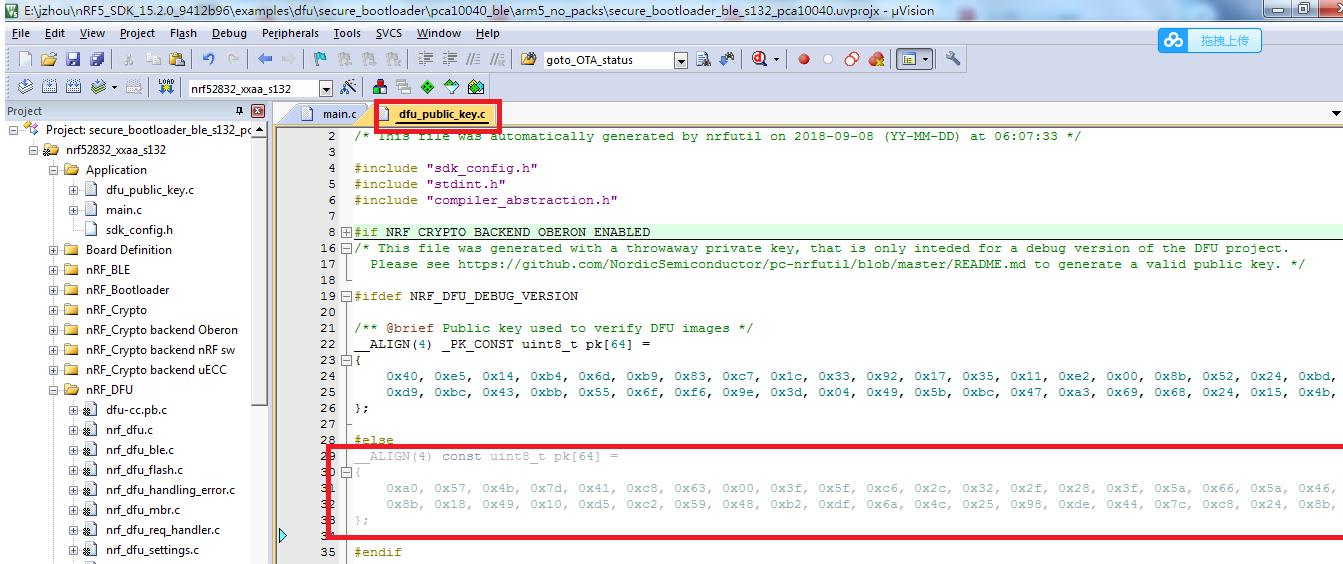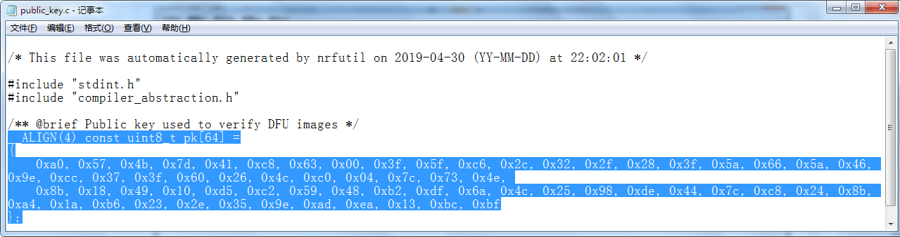 粘贴到dfu_public_key.c文件中(粘贴前先将#error这行删除掉)