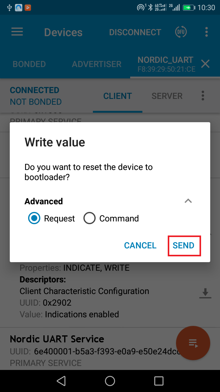 4.点击notify左边的按钮打开写数据界面,打send发送使设备进入bootloader 模式
