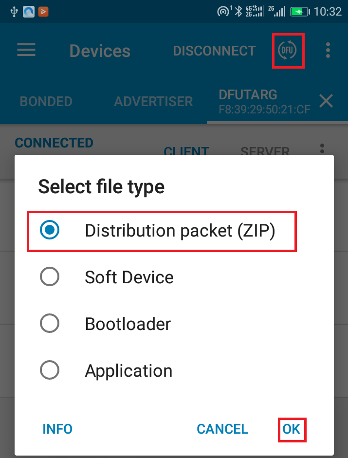 7.点击右上角的DFU按钮打开加载升级文件页面,点击OK键去加载nrf52832_xxaa_app.zip升级包