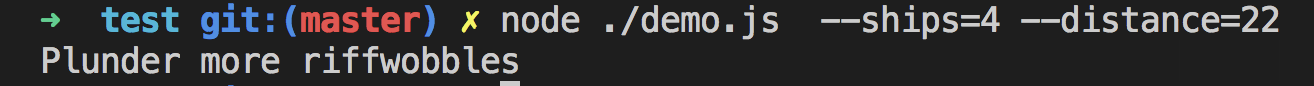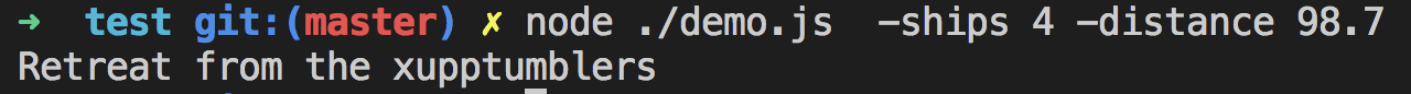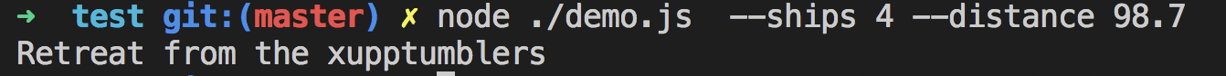 #!/usr/bin/env node //demo.js const yargs = require('yargs'); const argv = yargs.argv; if(argv.ships > 3 && argv.distance < 53.5) { console.log(`Plunder more riffwobbles`); } else { console.log(`Retreat from the xupptumblers`); }