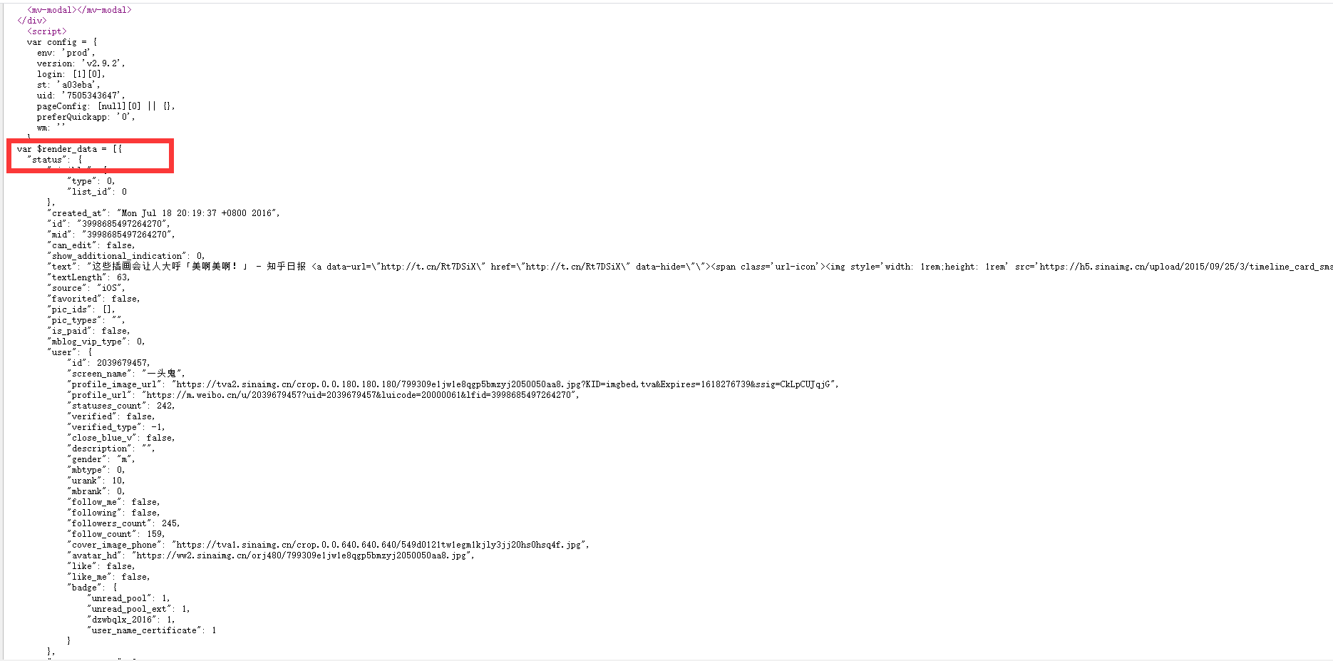 [{'status': {'visible': {'type': 0, 'list_id': 0}, 'created_at': 'Mon Jul 18 20:19:37 +0800 2016', 'id': '3998685497264270', 'mid': '3998685497264270', 'can_edit': False, 'show_additional_indication': 0, 'text': '这些插画会让人大呼「美啊美啊!」 - 知乎日报 <a data-url="http://t.cn/Rt7DSiX" href="http://t.cn/Rt7DSiX" data-hide=""><span class='url-icon'><img style='width: 1rem;height: 1rem' src='https://h5.sinaimg.cn/upload/2015/09/25/3/timeline_card_small_web_default.png'></span><span class="surl-text">我想这些插画会让你大呼「美啊美啊!」</span></a> ', 'textLength': 63, 'source': 'iOS', 'favorited': False, 'pic_ids': [], 'pic_types': '', 'is_paid': False, 'mblog_vip_type': 0, 'user': {'id': 2039679457, 'screen_name': '一头鬼', 'profile_image_url': 'https://tva2.sinaimg.cn/crop.0.0.180.180.180/799309e1jw1e8qgp5bmzyj2050050aa8.jpg?KID=imgbed,tva&Expires=1618278724&ssig=kKLHnt6sim', 'profile_url': 'https://m.weibo.cn/u/2039679457?uid=2039679457&luicode=20000061&lfid=3998685497264270', 'statuses_count': 242, 'verified': False, 'verified_type': -1, 'close_blue_v': False, 'description': '', 'gender': 'm', 'mbtype': 0, 'urank': 10, 'mbrank': 0, 'follow_me': False, 'following': False, 'followers_count': 245, 'follow_count': 159, 'cover_image_phone': 'https://tva1.sinaimg.cn/crop.0.0.640.640.640/549d0121tw1egm1kjly3jj20hs0hsq4f.jpg', 'avatar_hd': 'https://ww2.sinaimg.cn/orj480/799309e1jw1e8qgp5bmzyj2050050aa8.jpg', 'like': False, 'like_me': False, 'badge': {'unread_pool': 1, 'unread_pool_ext': 1, 'dzwbqlx_2016': 1, 'user_name_certificate': 1}}, 'reposts_count': 0, 'comments_count': 0, 'attitudes_count': 0, 'pending_approval_count': 0, 'isLongText': False, 'reward_exhibition_type': 0, 'hide_flag': 0, 'mlevel': 0, 'darwin_tags': [], 'mblogtype': 0, 'more_info_type': 0, 'number_display_strategy': {'apply_scenario_flag': 3, 'display_text_min_number': 1000000, 'display_text': '100万+'}, 'content_auth': 0, 'pic_num': 0, 'alchemy_params': {'ug_red_envelope': False}, 'page_info': {'object_type': 2, 'type': 'webpage', 'page_pic': {'url': 'https://tc.sinaimg.cn/maxwidth.2048/tc.service.weibo.com/pic4_zhimg_com/ce37720f8fb18b09c17161967c6d92aa.jpg'}, 'page_url': 'https://weibo.cn/sinaurl?luicode=20000061&lfid=3998685497264270&u=http%3A%2F%2Fdaily.zhihu.com%2Fstory%2F8553336', 'url_ori': 'http://t.cn/Rt7DSiX', 'page_title': '我想这些插画会让你大呼「美啊美啊!」', 'content1': 'John Bauer (1882-1918),瑞典插画家,主要为北欧传说童话作插画。许多瑞典小孩都是读着他插画的故事长大的。@Erik Daae 认认真真写答案,不知道会不会有人看到呢╮(╯▽╰)╭ 多图,但我保证一定会有让你大呼“美啊美啊!”的图。 他笔下的 Troll(北欧童话中的一种巨人怪物,经典的反派角色),并不是像一般反派一样面目狰狞的,反而是胖乎乎的挺可爱的。 从上面这幅图中,我们可以发现有着珍珠般的光辉的人类公主,与灰暗的背景和不那么美丽的 troll 形成了对比。美丽纯洁的人类女孩与狡猾的 troll,是许多瑞典童话的主要角色,也是 John Bauer 重点描绘的对象。'}, 'bid': 'DFpg9utLE', 'buttons': [{'type': 'follow', 'name': '关注', 'sub_type': 0, 'params': {'uid': 2039679457}}], 'status_title': '这些插画会让人大呼「美啊美啊', 'ok': 1, 'scheme': 'https://weibo.cn/appurl?scheme=sinaweibo%3A%2F%2Fdetail%3Fmblogid%3D3998685497264270%26luicode%3D20000061%26lfid%3D3998685497264270&luicode=20000061&lfid=3998685497264270', 'tipScheme': 'https://weibo.cn/appurl?scheme=sinaweibo%3A%2F%2Fdetail%3Fmblogid%3D3998685497264270%26luicode%3D20000061%26lfid%3D3998685497264270&luicode=20000061&lfid=3998685497264270'}, 'hotScheme': 'https://m.weibo.cn/p/index?containerid=106003type%3D25%26t%3D3%26disable_hot%3D1%26filter_type%3Drealtimehot&luicode=20000061&lfid=3998685497264270', 'appScheme': 'https://m.weibo.cn?luicode=20000061&lfid=3998685497264270', 'callUinversalLink': False, 'callWeibo': False, 'hit': True, 'is_gray': 1, 'schemeOrigin': False, 'appLink': 'sinaweibo://detail?mblogid=3998685497264270&luicode=20000061&lfid=3998685497264270', 'xianzhi_scheme': 'xianzhi://mblogshow?mid=3998685497264270', 'third_scheme': 'sinaweibo://detail?mblogid=3998685497264270&luicode=20000061&lfid=3998685497264270', 'call': '1'}]