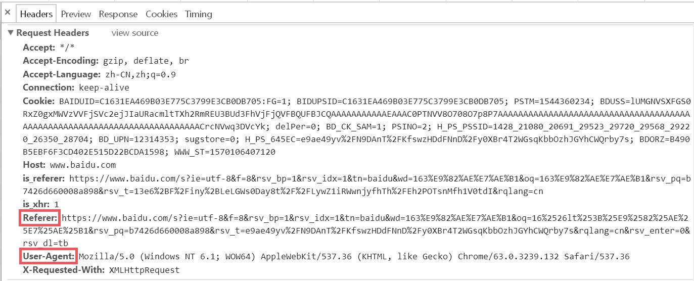 在上图中,我们可以看到 Request Headers 中包含 Referer 和 User-Agent 两个属性信息,Referer 的作用是告诉服务器该网页是从哪个页面链接过来的,User-Agent 中文是用户代理,它是一个特殊字符串头,作用是让服务器能够识别用户使用的操作系统、CPU 类型、浏览器等信息。通常的处理策略是:1)对于要检查 Referer 的网站就加上;2)对于每个 request 都添加 User-Agent。