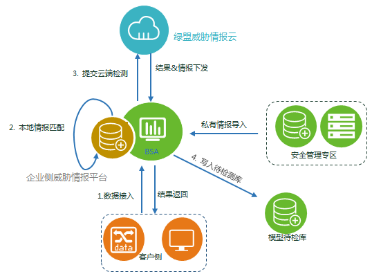 情报匹配流程如图1所示。NTI情报匹配包含三个情报资源库,其中,绿盟威胁情报云是不断更新的情报库;私有情报是客户自有的情报数据,具有个性化的特点;企业侧情报由绿盟威胁情报云下发的情报和私有情报共同组成,随着平台运行而不断更新并且缓存在本地。这种本地情报生成方式在匹配过程中,能减少网络通信,提高匹配效率。NTI情报匹配过程以BSA平台为中心,进行数据处理。BSA从客户侧接入待检测数据可以是直接的http访问数据,也可以原始流量类数据,如绿盟uts探针数据、netflow流量数据。这种流量数据可以通过BSA平台解析出其中的通信实体,从而进行情报匹配。