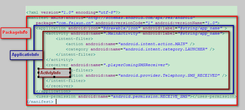 通过前面的介绍,相信您一定很了解了,本质上来讲,这些XXXInfo类不过是我们在AndroidManifest.XML文件中定义的信息,
