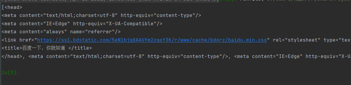 操作文档树最简单的方法就是告诉它你想获取的tag的name.例如想获取 <head> 标签,只要用 soup.head 会返回第一个搜索到的目标,如果想要全部查询可以使用bs.findAll()