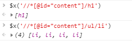 此外,还可以在console中使用表达式 $x('xpath表达式') 来获取相应节点: