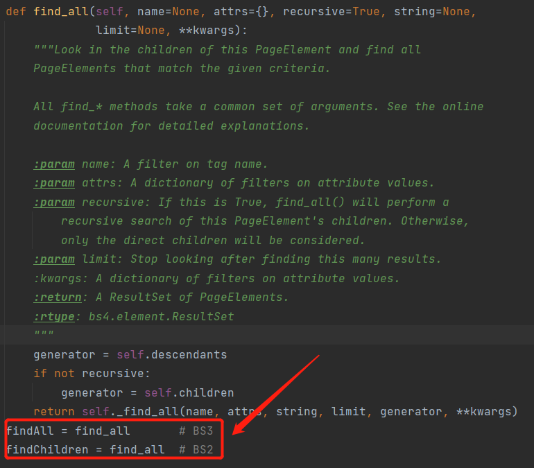 而BS4推荐使用find_all(),这个findAll仅仅是为了兼容BS3,