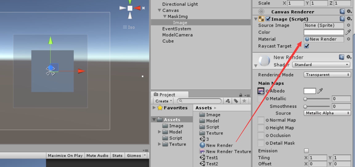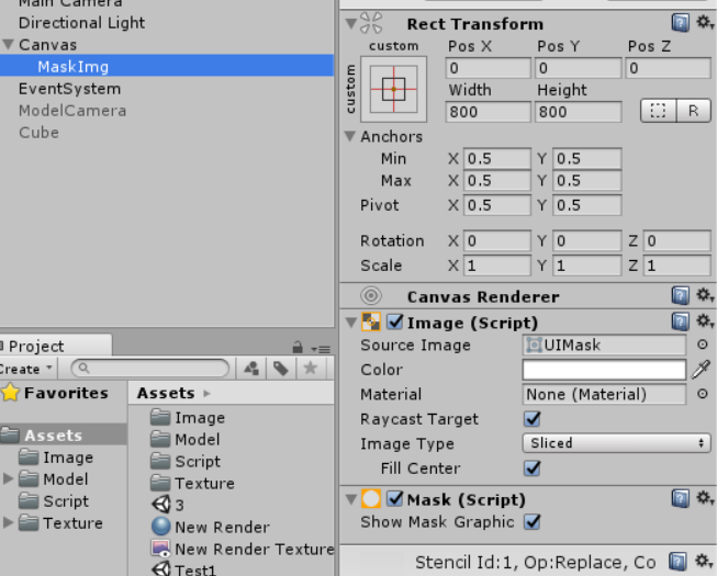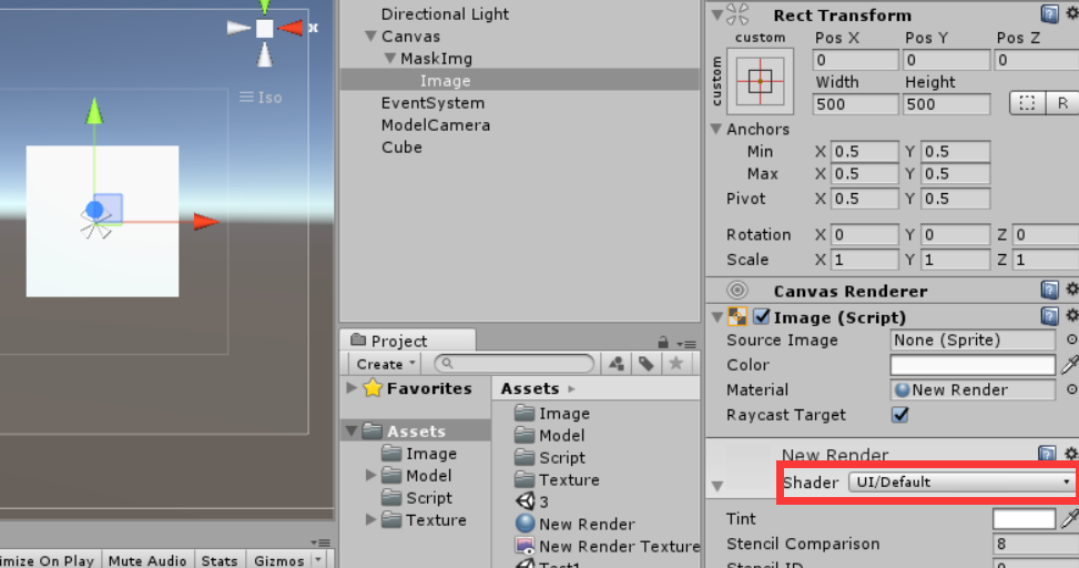 - 在MaskImg新建子物体Image,用于展示模型。然后将新建的 Shader拖入Image上。如下图,此时就已经看到模型的一面在Image上显示出来了。