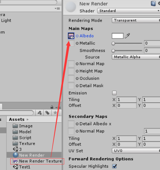 - 首先新建一张RenderTexture,右键点击Project窗口,Create->Render Texture;