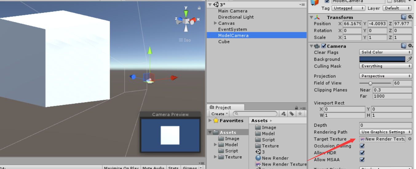 - 新建一个Cube 和一个相机名为ModelCamera,这个相机专门用来对准模型,并将刚刚新建的RenderTexture拖入相机的TargetTexture中。