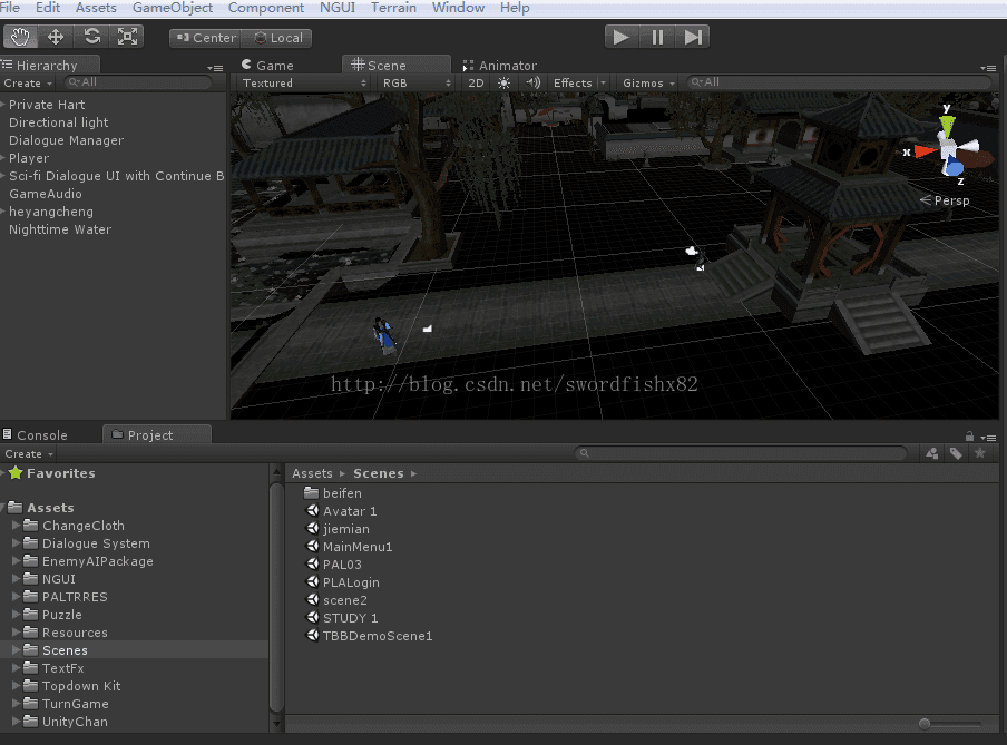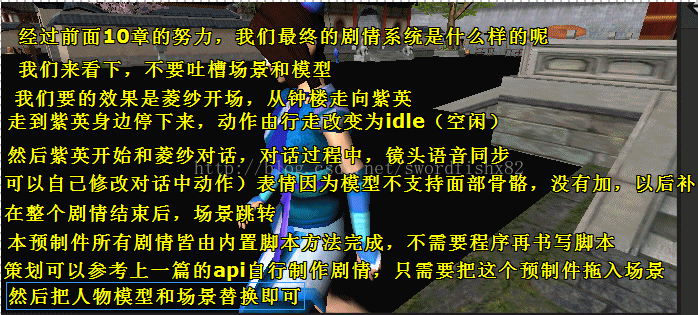 好了,忙忙活活,看到效果了吧,如果对效果不满意,想要考虑做一个电视剧级别的剧情系统,那么建议在制作过程中,招聘一名专业的分镜师,这就不在我们讨论的范围内了,以上这个东西是怎么实现的呢,就是我们前面用得到东西,我已经把整个需要的东西写好了做成预制件了,想使用,只要拖预制件进场景,然后改模型,设计剧情就可以了,另外,这几天玩了下新剑侠传奇这款游戏,为比较下当下的过场游戏剧情系统,新剑侠传奇用的在同一场景触发模式来完成剧情,就是在同一场景中设置很多开关(bool变量),当进入这个剧情时,这个开关开启,然后,当化身进入碰撞区域时触发剧情,当完成剧情,开关关闭,这种模式有个好处,就是剧情触发不需要加载多余的资源,不用场景转换,缺点吗,同一场景添加过多的开关真的好吗?另外因为剧情中除了剧情中必要的人物之外,有大量不需要的物品人物存在,可能造成测试的工作量加大,因为不可控因素可能增加,我举个例子,比如街道上要触发一个剧情,但开始街道上有一个自动寻路的路人,当剧情触发时,如果这个路人恰好走到对话的几个人中间,那就对我们需要的剧情产生了遮挡,这个虽然我们在测试中会发现改动,比如控制npc活动路线等等,但人为的加大工作量,我觉得,没有必要,不过如果游戏一定需要这样,那么说一下怎么制作,首先在场景中放一个空预制件,在这个预制件上面绑一个触发器(一会我会讲什么东西),然后把预制件拉到预制件文件夹,删除场景中的,在需要的地方做一个触发器(碰撞检测),当触发时,instance这个预制件。