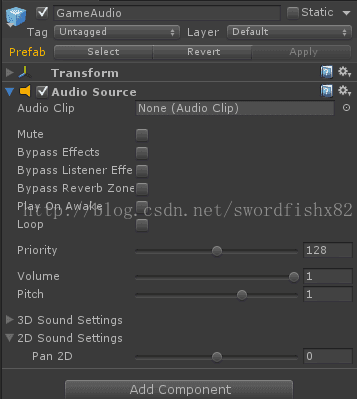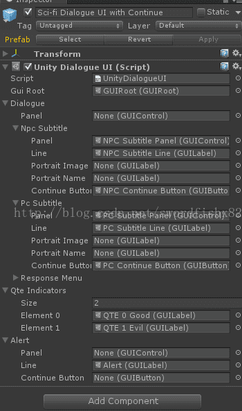 其实他就是场景中的一个空的gameobject,上面绑了一个audiosource组件,小伙伴要问了为什么不在韩菱纱和紫英身上帮这个呢,这是因为,我们的对话是设定为,当点击鼠标左键在字幕上的时候跳过当前对话,如果在两个人身上都绑定的话,要注销上一个声音控制,然后启动下一个,这个在实际应用中很麻烦,在场景中尽量只用一个声音的好处就是不会出混声,比如,菱纱没说完话,玩家点了跳过,结果紫英说话了, 这时有可能出现两个声音,要规避,需要写格外的代码,所以我们直接使用这种单一声音来源,来解决