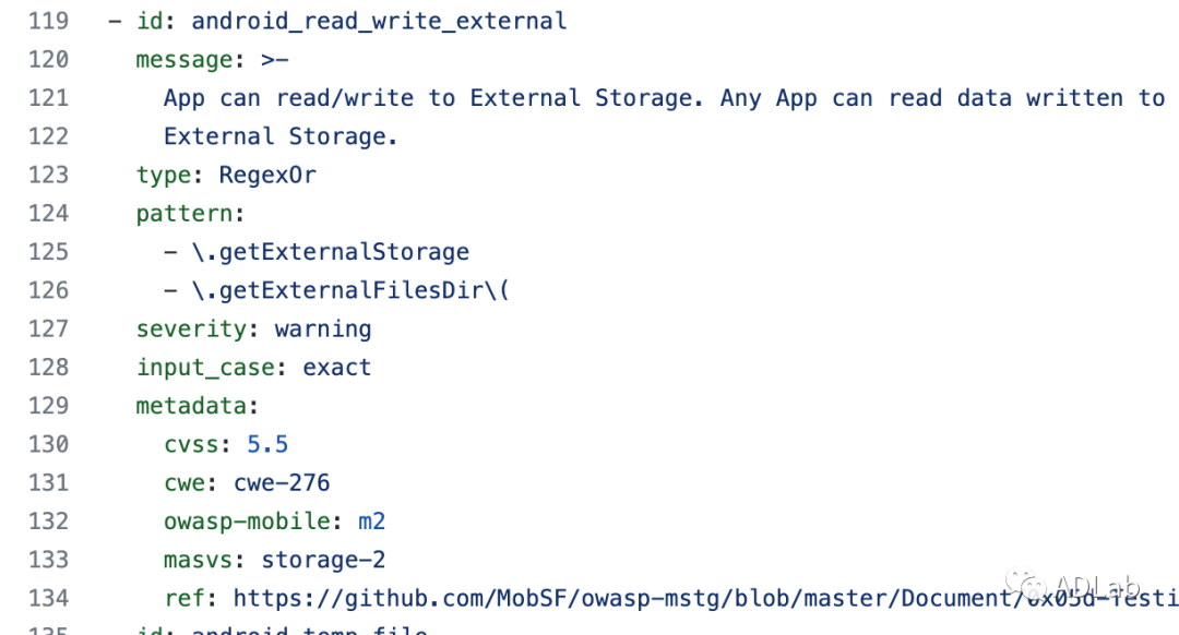 [2]https://github.com/MobSF/Mobile-Security-Framework-MobSF/blob/master/mobsf/StaticAnalyzer/views/android/rules/android_rules.yaml