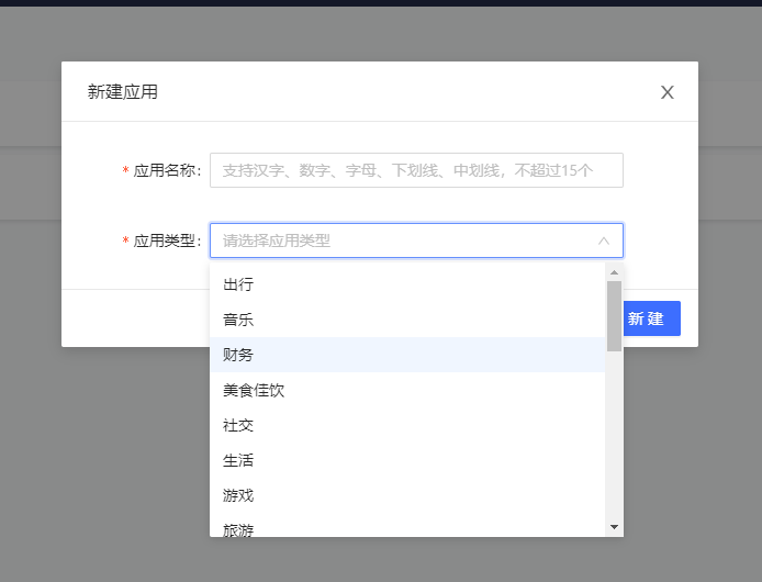 输入并选择你的应用类型,创建应用