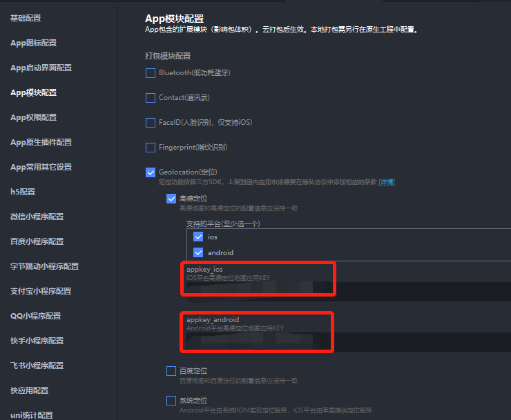 勾选"Geolocation(定位)"并选择"高德定位",选择你对应所需平台(以两个平台为例),将高德拿到的key填到对应的地方上