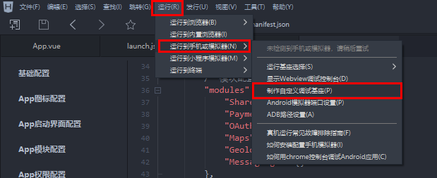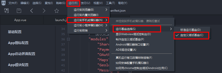 打包完成后,点击"运行"找到"运行到手机或模拟器"选择"运行基座选择"使用"自定义调试基座"
