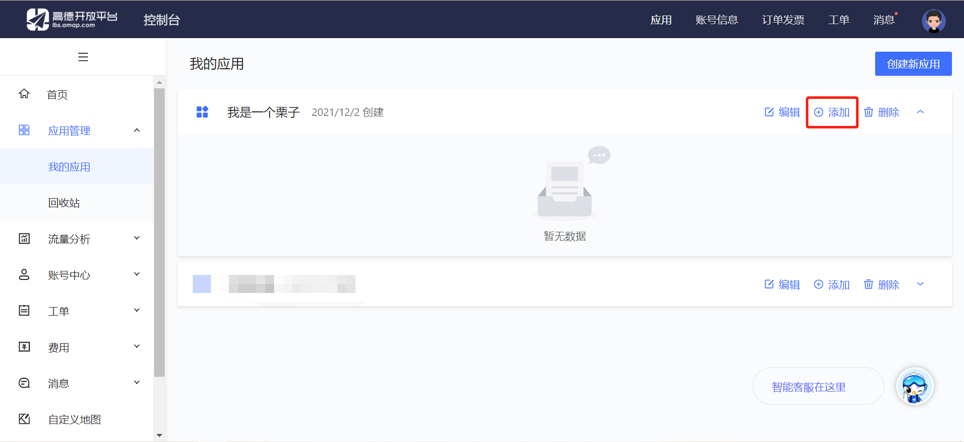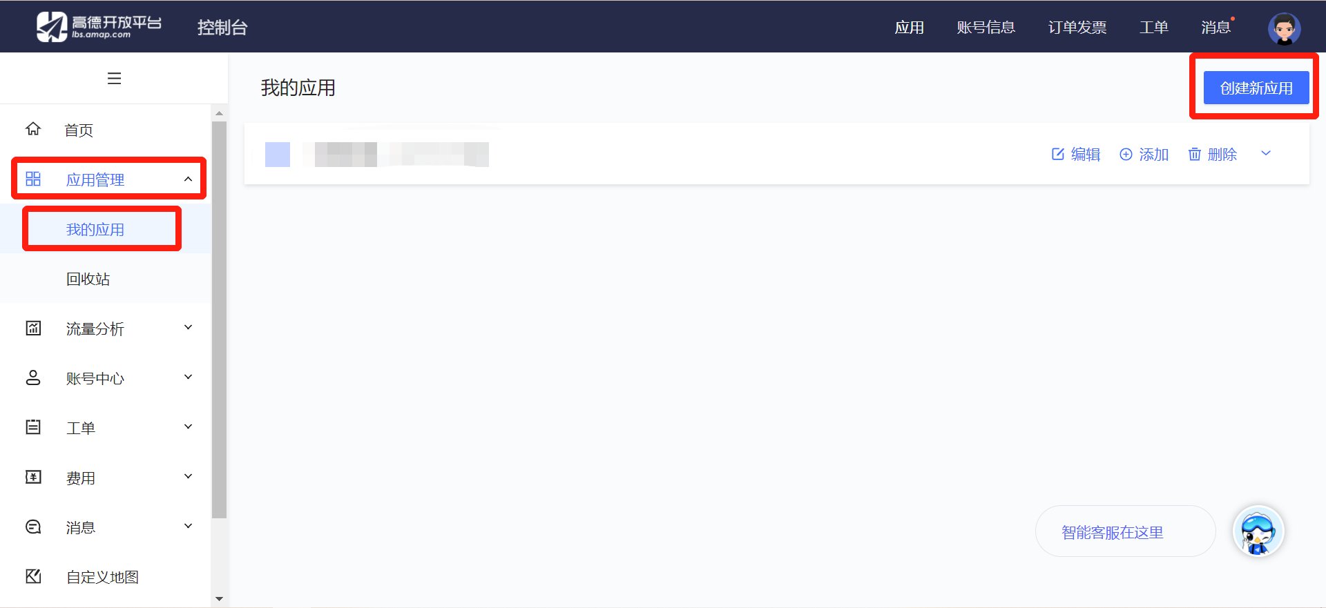 进入控制台首页,在侧边栏上点击打开"应用管理",看到"我的应用"点击进入页面,就可以看到"创建新应用"按钮