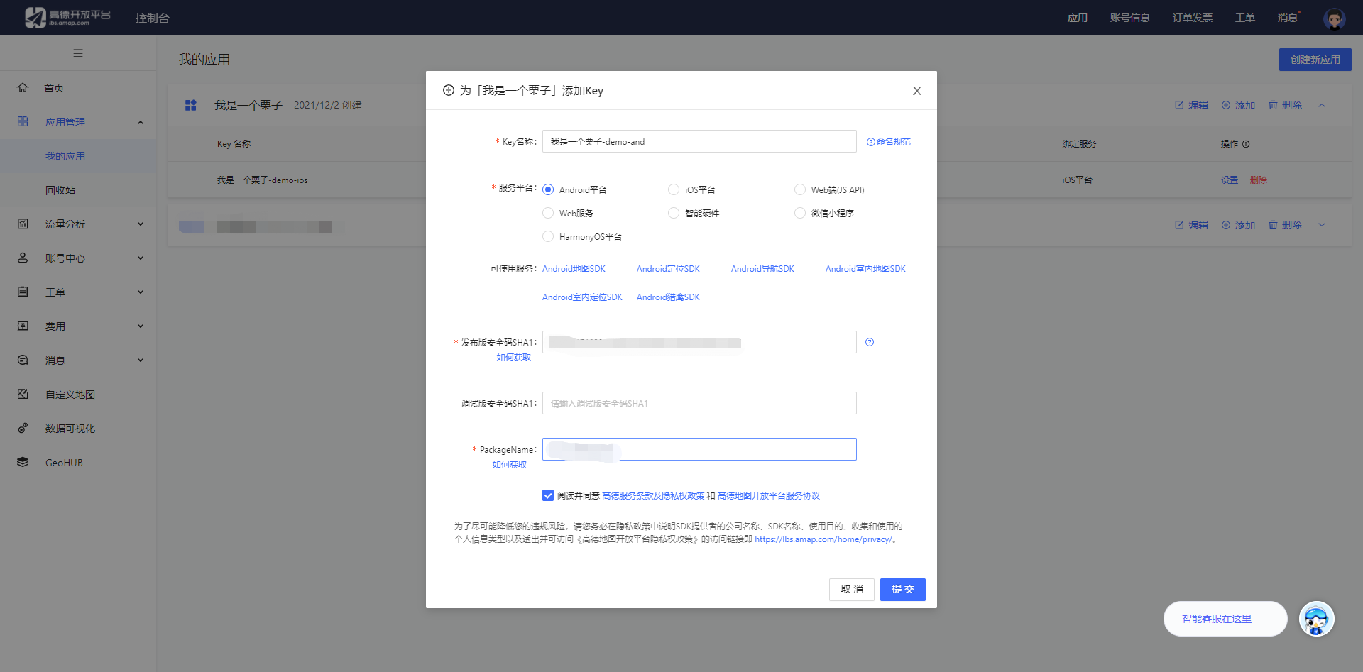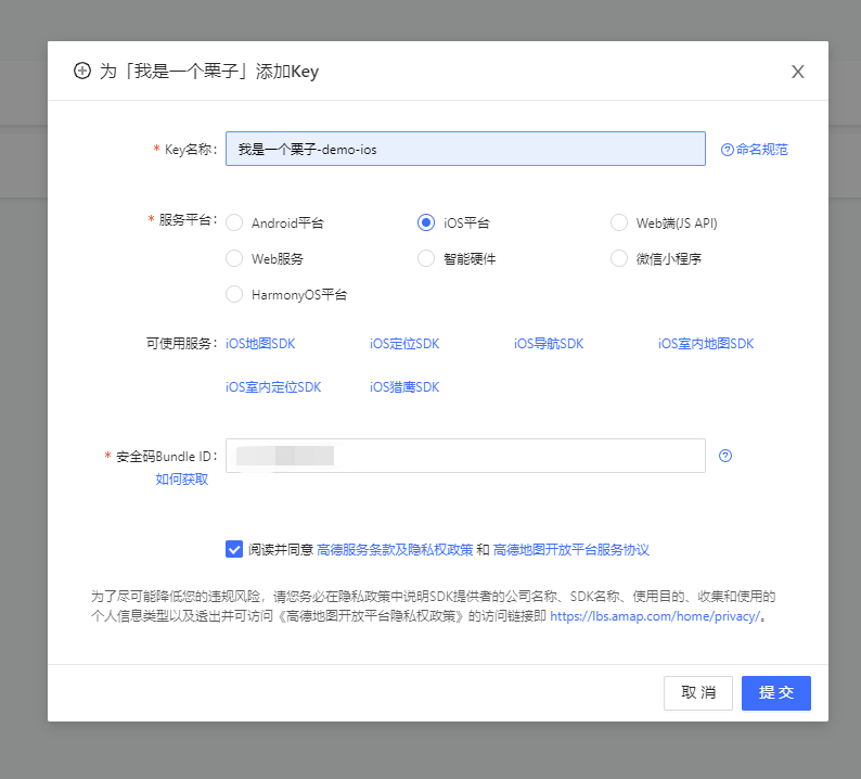 填写添加Key的信息(分别以IOS及安卓为例)