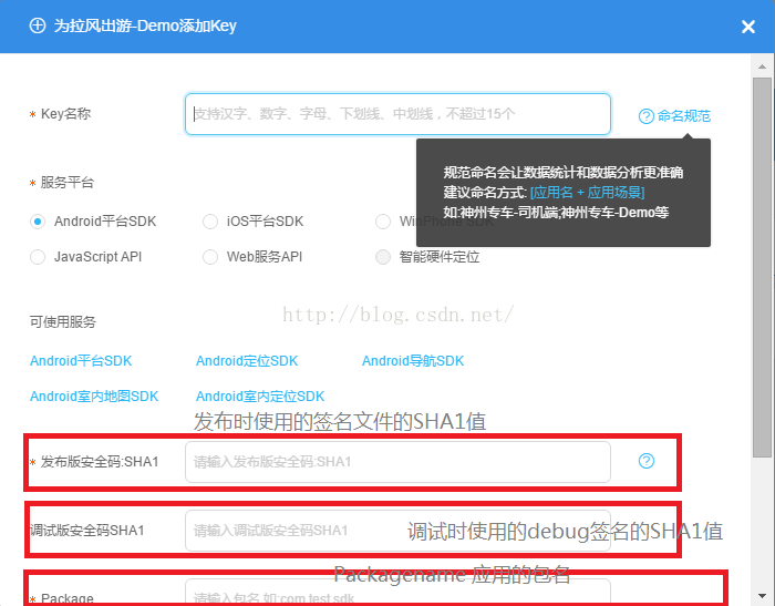 点击添加新key 输入完毕后再下方点击提交 获取SHA1值以及应用包名见下方
