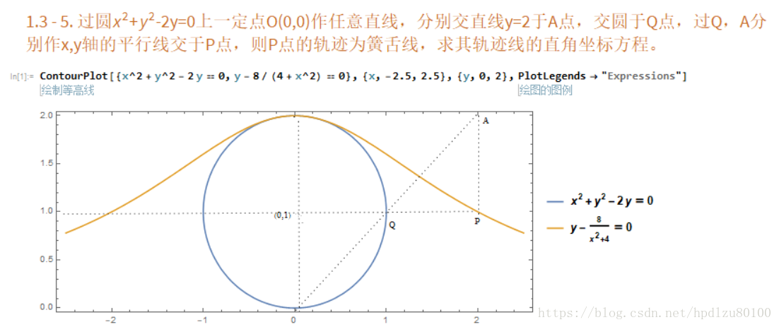 题目:1.3 - 5. 过圆x^2+y^2-2y=0上一定点O(0,0)作任意直线,分别交直线y=2于A点,交圆于Q点,过Q,A分别作x,y轴的平行线交于P点,则P点的轨迹为簧舌线,求其轨迹线的直角坐标方程。