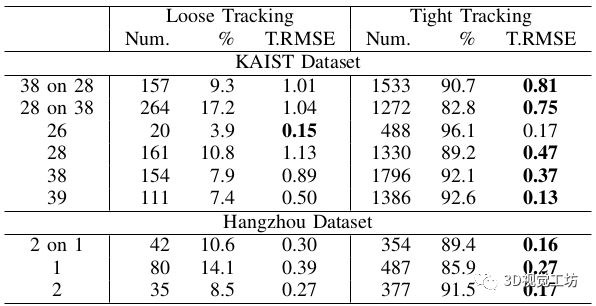 下表表示我们的定位所涉及的两种跟踪状态的统计数据。在大多数情况下,我们的方法在紧密跟踪模式下运行,这反映了更好的定位精度。