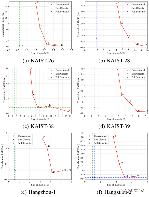 在这个测试中,我们对每个序列运行两次,分别进行测绘和地图辅助定位。图7列出了测试序列的结果。我们提出的方法所产生的语义图需要的文件大小要少得多,同时提供了有竞争力的定位性能。例如,KAIST-38的语义地图占据了1.54MB的磁盘空间来达到0.46米的定位精度,而传统的地图在设置K=8时需要7.60MB来达到0.75米。对杭州序列的测试也反映了同样的趋势。总的来说,我们提出的方法中的语义图要比那些设定的覆盖点特征图小近5倍,才能达到类似的定位性能。