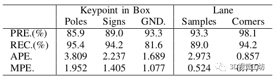 我们使用匈牙利匹配策略,在像素空间中以实例和像素的方式关联地面特征:1)在实例关联期间,我们计算交叉联合(IoU),对于常规物体的多边形和对于车道的5.0像素宽度的折线。2)在像素方面的关联中,我们计算其索引关键点的重投像素距离。IoU百分比<50%和像素距离>5.0的匹配被忽略。