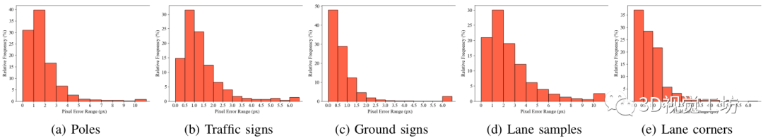 结果显示了我们训练的深度模型在KAIST数据集上的表现,由于它们在图像上的不同表现,盒子里的物体被分为三个有代表性的子类型(电线杆、交通标志和地面标志)。我们在测试集上分别评估这些任务,得出它们的分类精度、检测召回率,另外,表中的提取像素误差,下图为像素误差的分布直方图。