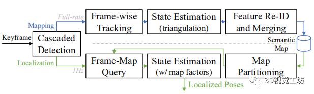 在离线建图过程中,感知模块对每个关键帧都要执行。然后,对连续关键帧之间的检测结果进行跟踪,以建立多视角关联,共同估计相机轨迹和地标位置。随后,在以前访问过的路段上重新观察到的实例被重新识别,并通过循环检测进行合并。最后,这些优化的状态被序列化为地图资产用于定位。在在线地图辅助定位过程中,感知模块以较低的频率运行,以实现对计算单元的低成本消耗。因此,语义特征是通过混合检测和跟踪策略获得。这些特征与保存的地图相匹配,并由一个基于滑动窗口优化的测距系统使用,以减少全局漂移。