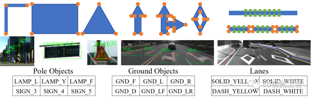 考虑到地图的稀疏化和查询的有效性,城市道路上的以下标准化目标适合作为语义地标来检测:1)道路旁边电线杆顶部的灯和交通标志足够稳定和高,可以被前置摄像头捕捉。2)虽然有时会被车辆遮挡,但地面区域几乎占据了每张图像的一半,这使得那些涂在地面上的高对比度标志无法被忽略。3)与地面标志类似,涂有实线和虚线的车道也经常被观察到。实线车道提供了一个方向的运动约束,虚线车道的拐角可以被视为索引点地标。在这项工作中,我们选择上述语义类型作为目标对象,以建立我们的语义地图。