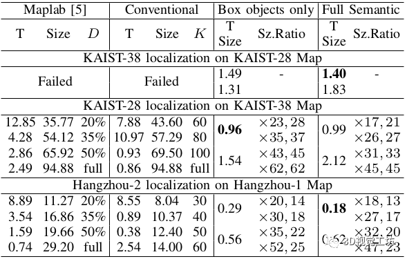 下表显示了这种对等的交叉定位结果。可以看出,我们提出的含有方框物体和道路车道的语义地图的方法在所有交叉验证测试中都完成了成功的定位。对于传统地图,我们用包括全尺寸地图在内的多种设置进行测试。不幸的是,由于在不同季节和时间段捕获的视觉特征的严重变化,在28序列的地图上运行KAIST-38序列的定位始终失败。因此,集合覆盖稀疏化需要应用更大的K值来进行交叉重定位,以保持足够可靠的特征。对于Maplab来说,由于保留的信息量大的三维点通常与更多的局部视觉描述符有关,因此结果的地图大小比预期的要大。相比之下,我们提出的方法依赖于从标准化和持久化的道路元素中提取的深层特征。总之,这种语义替换在交叉定位上比传统地图和Maplab都有更大的优势,对杭州序列的实验也反映了同样的趋势,这表明在紧凑性和定位精度上都有优势。