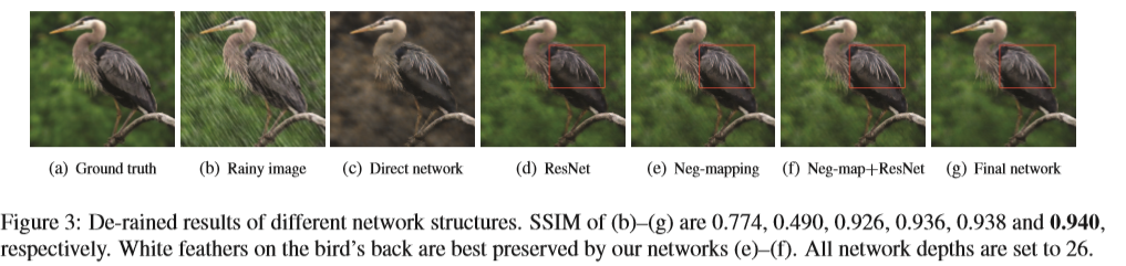 引入残差网络,观察4(e)(g)发现残差Y-X有显著的像素值范围减小,这说明残差可以被引入神经网络来帮助建立输入到输出的映射过程(这里不太懂为什么像素值减少了就有助于训练了,但是意思是我们可以通过加一个从输入到输出的类似于残差的映射,使得输出的结果更好,可以看到figure 3(e)即neg-mapping的结果比单纯残差网络3(b)要好,它没有模糊掉鸟的羽毛)。因为雨的颜色是白色的(C白色为255,黑色为0),所以干净图-雨图(Y-X)的值通常是负的,所以叫做 “negative residual mapping” (简称neg-mapping)。修改后的公式如下: