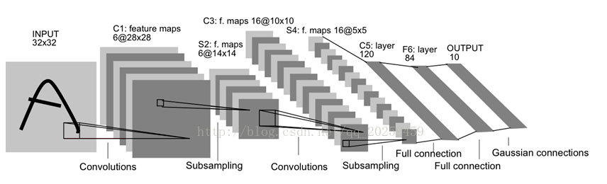 图中由INPUT到C1的卷积操作大小是 1*5*5*6 的卷积大小,因为INPUT是灰度图片,所以通道为1,而feature maps的深度为6,5*5是这里的卷积核大小(输出是28*28是由卷积核尺寸和步长等因素决定)
