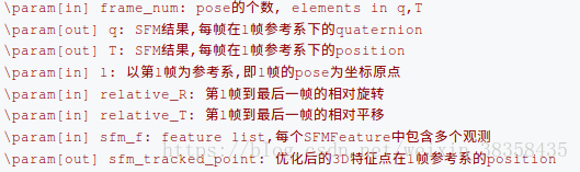 4.4.2.4.9 BA优化,使用的是ceres优化位姿和特征点,residuals用的特征点到每一帧重投影误差, 将求解结果写出到q,T和sfm_tracked_points