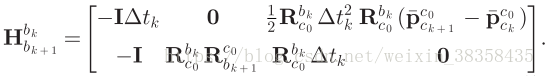 最终的矩阵形式如下:具体推导见IMU预积分及残差雅克比计算