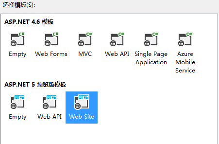 打开VS2015,创建Web项目,选择ASP.NET Web Application,在弹出的窗口里选择ASP.NET 5 Website模板创建项目,图示如下: