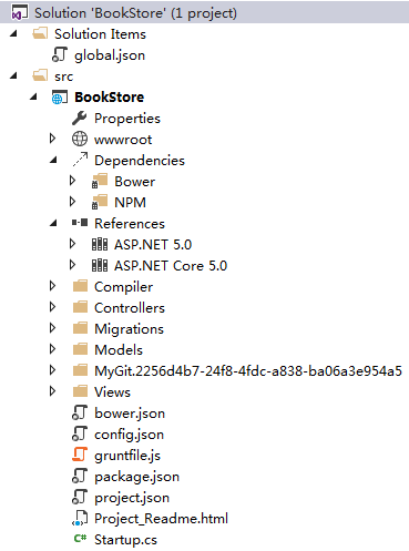 通过图示,我们可以看到,在根目录中,不仅项目文件从从csproj变成了xproj,还少了很多之前的文件(如web.config),但也多了很多不同的文件以及文件夹,我们先列出这些不同的文件盒文件夹,再来一一讲解这些内容。