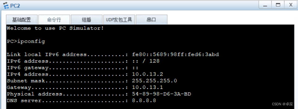 可以看到PC2获取了全局地址池的ip地址,并且固定为10.0.13.2,说明静态绑定mac地址分配配置成功。