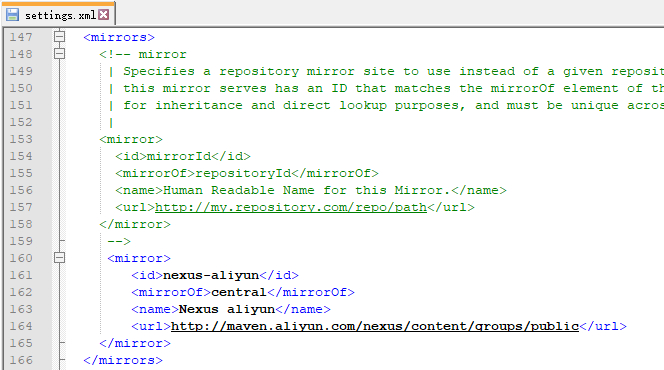 可以添加阿里云的镜像到maven的setting.xml配置中,这样就不需要每次在pom中,添加镜像仓库的配置,在mirrors节点下面添加子节点: